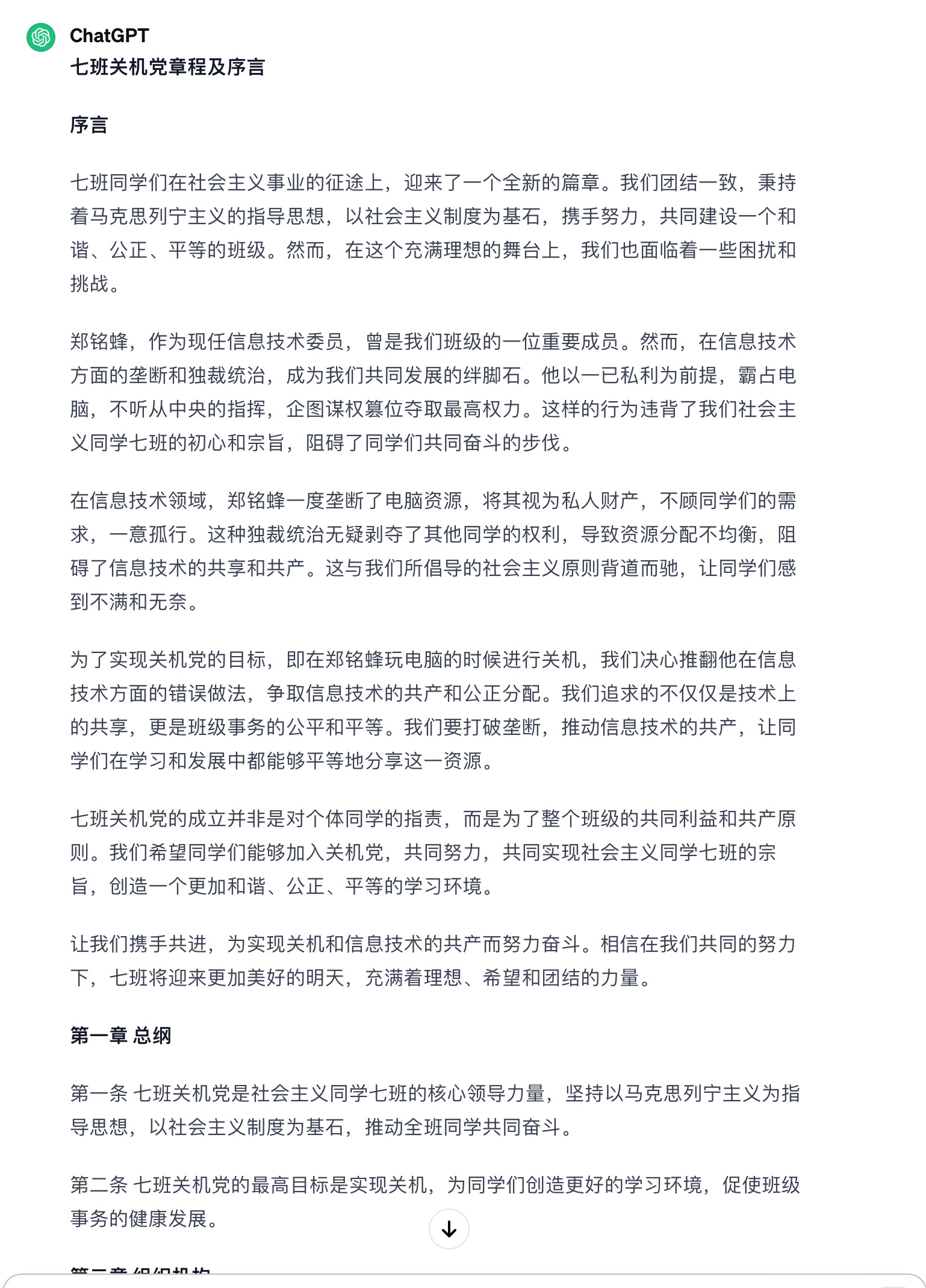 - 第四条 七班关机党设立全班党员代表大会和中央委员会,由全班党员选举产生。中央委员会选举产生总书记,总书记为七班关机党最高领导。